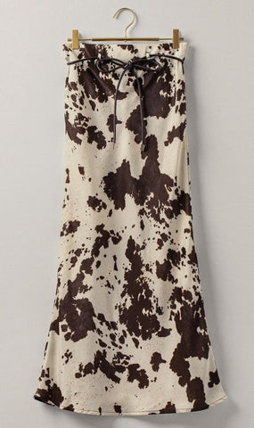 Cow print, satin midi skirt, subtle sheen, slim adjustable drawstring, a-line silhouette with flares at hem.