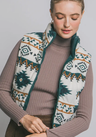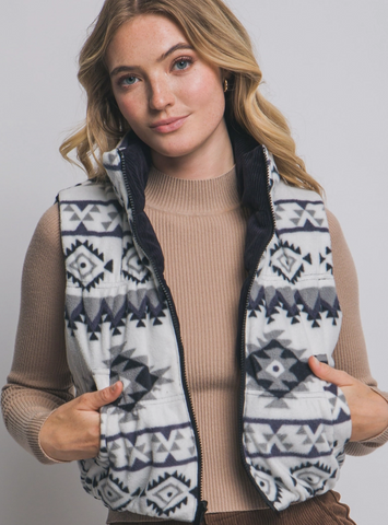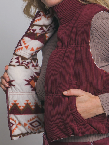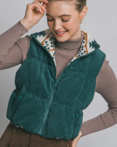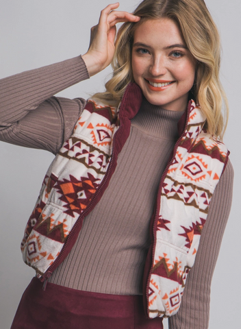Reversible plush corduroy, aztec fleece inside, cropped, zip up, snap pockets, high neck, puffer vest.