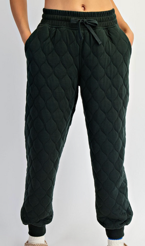 GN-Quilted fabric, warm, light weight.  Top-slightly cropped, relaxed oversized fit, drop shoulder, hoodie, 1/4 zip up, kangaroo pocket, thumbhole, ribbed neckline and hem.  Bottom-jogger pants, elastic draw string waist, side pockets, ribbed cuffs.