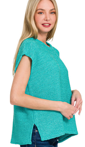 RB, TQ- Oversized, crew neck, side slits, slight Hilo hem, solid sweater vest. 75% acrylic 25% nylon