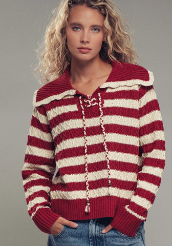 CSM-textured stripe, lace up, Peter Pan ribbed scallop edge collar, cable knit pattern, chunky ribbed cuff and hem, relaxed fit, slightly cropped. 60% cotton 40% acrylic