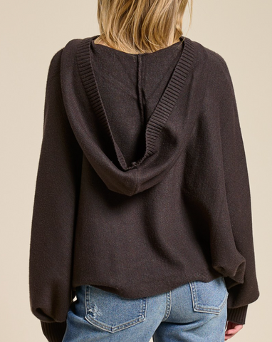 Gunmetal color, cashmere blend, hoodie, sweater, ribbed details, slight cropped, ponchoish.