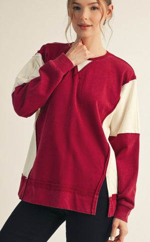 Long sleeve, color block, raw details, v notched neck, side slit. 80% cotton 20% polyester