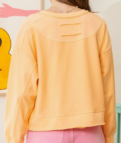Crew neck, Dorito-v, drop shoulder, cuff hem, exposed seams, raw edge, textured contrast, sweatshirt.