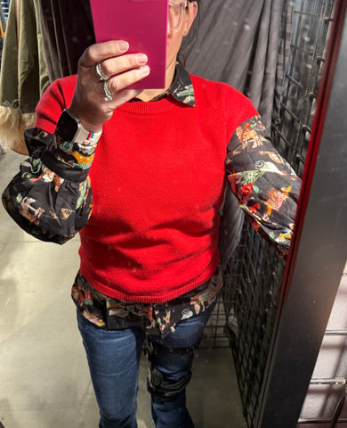 Semi-sheer chiffon fabric with a soft, breathable feel, colorful western-themed print with cacti, animals, and scenic illustrations, relaxed fit, full button-down, oversized point collar, long balloon sleeves with buttoned cuffs.