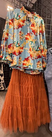 Frill self tie neck, long poet sleeve, non sheer, light weight, multi cow print.