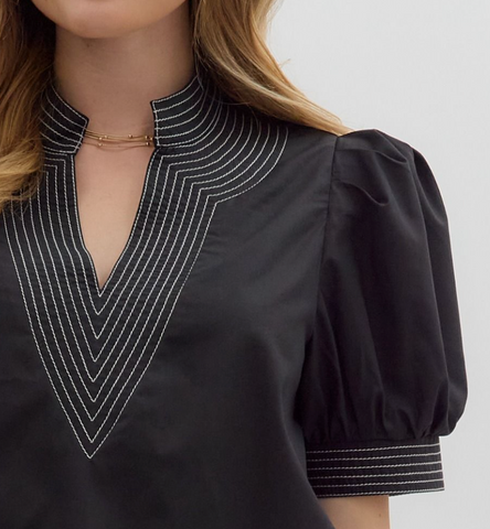 Solid, short puff sleeve, v neck, contrast stitching, unlined, light weight. 65% polyester 35% cotton