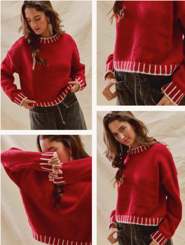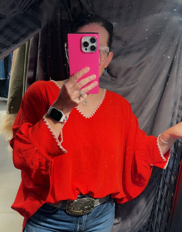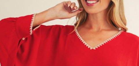 Drop shoulder, batwing sleeves, wide v neck, oversized fit, blanket stitch detail, button on cuffs, round hem. 100% polyester